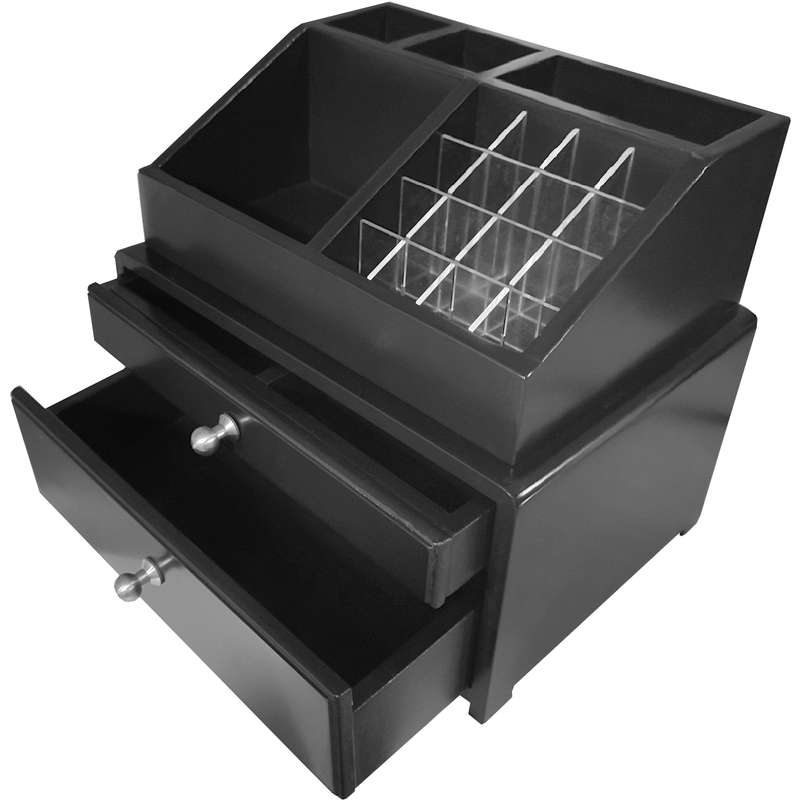 جعبه لوازم ارایش مدل مرجان دارای 2 بخش مجزا میباشد که از هم جدا هستند بخش اول که بالای جعبه قرار میگیرد از 16 خانه کوچک تشکیل شده که برای قرار دادن لوازم کوچک ارایشی و 4 خانه دیگر هم برای عطر و برس و غیر قسمت پاین جعبه هم دارای 2 کشو زیبا و کاربردی میباشد این جعبه ارایشی زیبا را میتوان در دو رنگ سفید و قهوه ای تیره سفارش داد