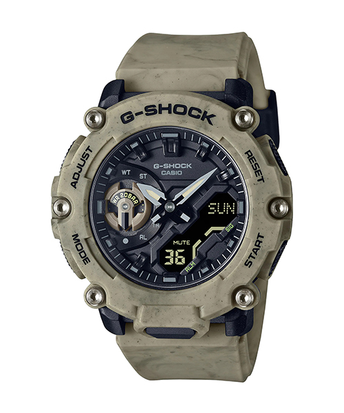 با انتخاب این مدل ساعت دیجیتال-آنالوگ نمادین G-SHOCK  با رنگ‌های غنی و بافت های شنی و صخره ای زمین های بیابانی، به سرزمین های بیابانی سفر کنید و تنوعی بدون زمان و جاودانه را تجربه کنید.  در فرآیند قالب گیری ترکیبی این ساعت ها، با قاب و بندی که با رزین دو رنگ خاکی مختلف ساخته شده‌ که یادآور شن و خاک مناطق بیابانی وسیع سیاره ای دیگر است.