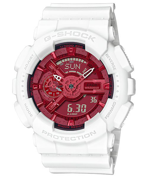 GA-110DBR با رنگ سفید ساده همراه با صفحه مدرج و نشانگرهای قرمز با رنگ‌آمیزی انباشت تبخیری عرضه می‌شود.