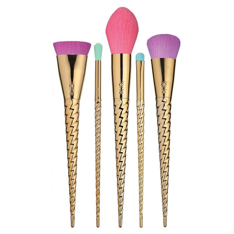ست براش تارت 5 تایی (TARTE Magic Wands Brush Set) شامل 5 براش آرایشی کانتور، کرم پودر، پودر و پنکک، سایه و براش پخش یا Blend کردن می باشد. طراحی خاص این براش های تارت به شکل چوبدستی جادو (Magic Wand) و طلایی رنگ می باشد و موهای براش هر کدام دارای رنگی منحصر به فرد هستند. موهای این براش تراکم مناسبی دارند و آرایش را بسیار آسان کرده اند. موهایی لطیف دارند و پوست را اذیت نمی کنند. این ست به دلیل طراحی زیبا و شیکی که دارد انتخابی مناسب برای هدیه می باشد.