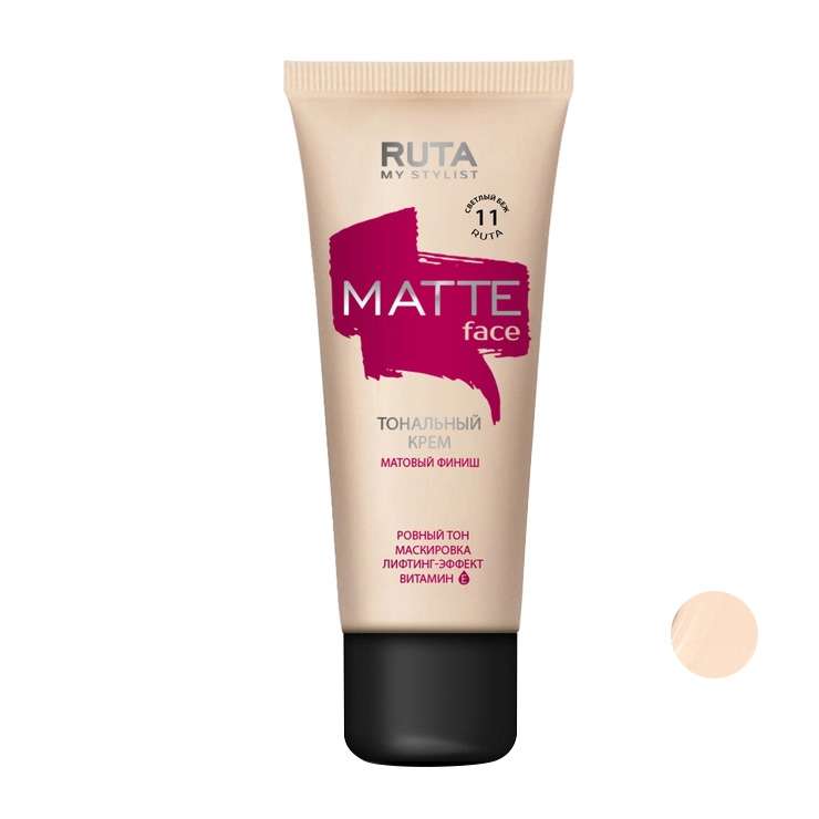 کرم پودر روتا مدل MATTE FACE ساخت روسیه اثرات استثنایی صافی و زیبایی بی نظیری به پوست شما می بخشد. این کرم پودر قرمزی و علائم خستگی را کاملا پنهان می کند و به پوست ماتی ملایم و نرمی می بخشد. این کرم پودر دارای 4 رنگ بژ مات بی نظیر است. روتا که به زبان روسی با الفبای سیریلیک Рута و به لاتین RUTA نوشته می شود محصولاتی بی نظیر سلامت و نسبتا مقرون به صرفه و کاملا مطابق با استاندارد جهانی تولید می کند.
